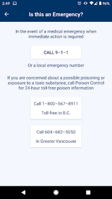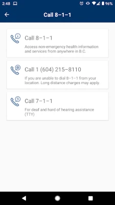 The app includes quick links to call our free of charge 8-1-1 provincial health information and advice phone line and access non-emergency health information and services in British Columbia.