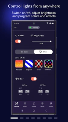 The Twinkly App is packed with unique features that let you control and manage your devices, play and customize effects, and design your own.